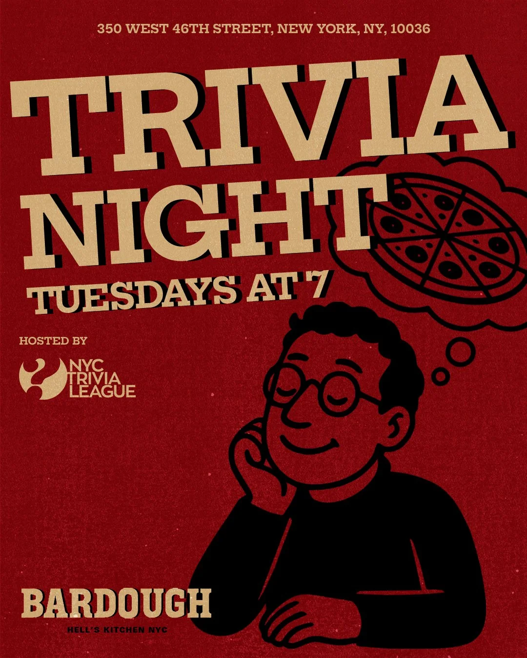 2025-02-25 19:00:002025-02-25 21:00:00America/New_YorkTuesday TriviaHosted by the wonderful Michelle from NYC Trivia League. Come show off your knowledge for a chance to win fun gifts and prizes. We recommend making reservations in advance as spots fill up quickly!BarDough NYCBarDough NYCcontactus@bardoughnyc.comAdd to Calendar